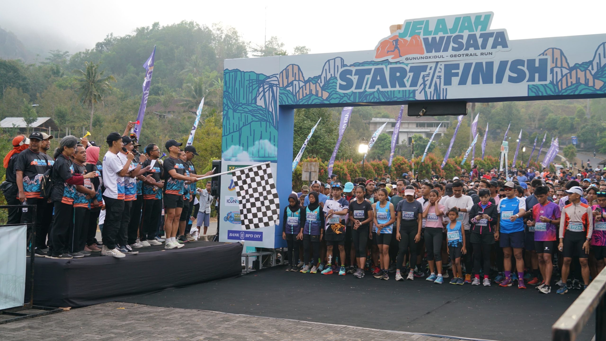 Gunungkidulpos – Ribuan peserta lari ramaikan event Jelajah Wisata 2024 yang digelar di Parkiran Embung Nglanggeran, Patuk, Sabtu (24/8/2024).